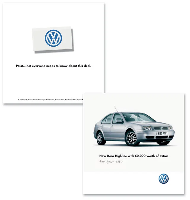 So we tapped into their mindset by sending out a mailer offering free extras on a Bora. The really clever bit? We printed all the value messages in erasable ink and sent out an eraser so they could rub out the savings messages before handing the brochure to their user choosers who would believe the extras, were compliments from the company.